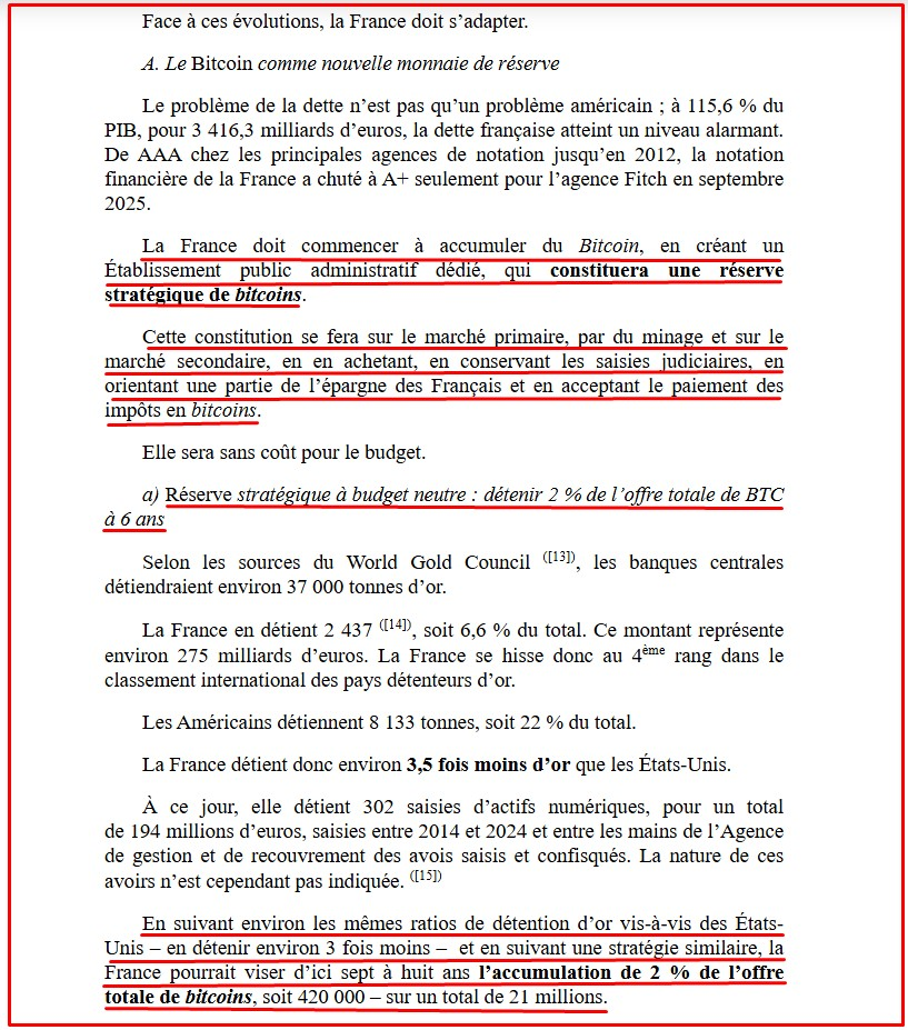 “A França deve começar a acumular Bitcoin, criando um Estabelecimento Público Administrativo dedicado, que constituirá uma reserva estratégica de bitcoins.”